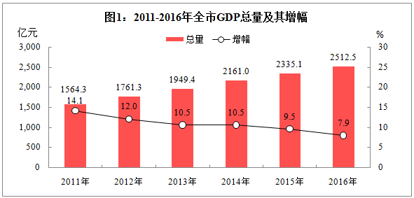 初步核算,全市完成地区生产总值2512.5亿元,比上年增长7.9%,高于全国平均水平1.2个百分点,与全省平均水平持平。其中,第一产业增加值197.2亿元,增长3.5%;第二产业增加值1363.5亿元,增长6.7%,其中,工业增加值1197.4亿元,增长6.7%;第三产业增加值951.8亿元,增长10.7%。按年末常住人口计算,人均地区生产总值62681元,增长7.1%。