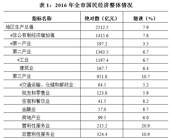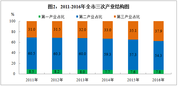 全市三次产业结构由2015年的7.6:57.3:35.1调整为7.8:54.3:37.9,第一产业和第三产业比重分别提升0.2个和2.8个百分点,第二产业比重回落3个百分点。第一、二、三产业对GDP的贡献率分别为3.4%、48.6%和48%。