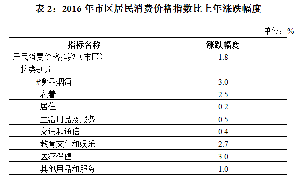 市区商品零售价格比上年上涨0.8%,工业生产者出厂价格下跌1.1%,工业生产者购进价格下跌2.0%,固定资产投资价格上涨3.2%。居民消费价格上涨1.8%。