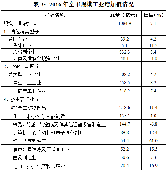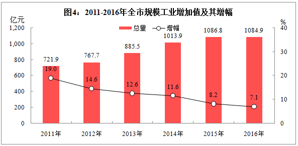 全市工业增加值1197.4亿元,比上年增长6.7%。其中,规模工业增加值1084.9亿元,比上年增长7.1%,分别高于全国、全省1.1和0.2个百分点。在规模工业中,非公有制企业增加值720.2亿元,增长6.5%。分行业看,非金属矿物制品业218.6亿元,增长11.4%;轨道交通装备业、汽车及零部件业、航空装备业等三大动力产业增加值197.5亿元,增长4.9%;化学原料及化学制品制造业155.1亿元,增长1%;计算机、通信和其他电子设备制造业89.8亿元,增长12.4%。战略性新兴产业增加值399.2亿元,增长6.9%;高加工度工业增加值518.2亿元,增长9.5%;高新技术产业增加值623.6亿元,增长17.3%;园区规模工业增加值779.8亿元,增长9%。