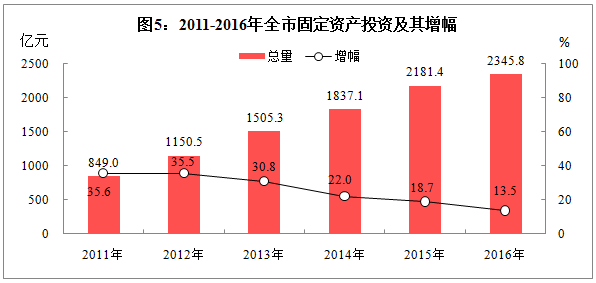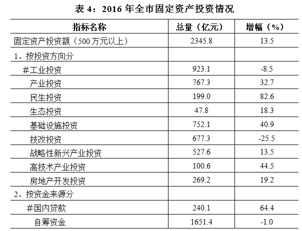 全市固定资产投资(不含农户)2345.8亿元,比上年增长13.5%,高于全国5.4个百分点、低于全省0.3个百分点。分经济类型看,国有投资941.8亿元,增长50.1%;非国有投资1404亿元,下降2.5%,其中,民间投资1246.4亿元,下降6.8%。分产业类型看,第一产业投资72亿元,增长27.7%;第二产业投资932.8亿元,下降8%,其中,工业投资923.1亿元,下降8.5%;第三产业投资1341亿元,增长34.5%。分投资方向看,基础设施投资752.1亿元,增长40.9%;民生投资199亿元,增长82.6%;生态投资47.8亿元,增长18.3%;高技术产业投资100.6亿元,增长44.5%;战略性新兴产业投资527.6亿元,增长13.5%。全年施工项目3779个,增长10.7%,其中,本年度新开工项目3346个,增长11.6%。全市亿元以上项目443个,比上年增加286个;新开工亿元以上项目262个,比上年增加188个。