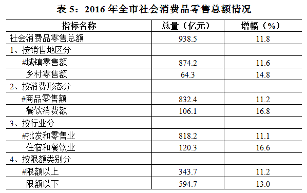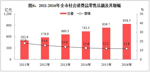 全市社会消费品零售总额938.5亿元,比上年增长11.8%,分别高于全国、全省1.4和0.1个百分点。分经营地看,城镇零售额874.2亿元,增长11.6%;乡村零售额64.3亿元,增长14.8%。分消费形态看,商品零售额832.4亿元,增长11.2%,餐饮消费额106.1亿元,增长16.8%。分行业看,批发和零售业818.2亿元,增长11.1%,住宿和餐饮业120.3亿元,增长16.6%。分限额类别看,限额以上343.7亿元,增长11.2%,限额以下594.7亿元,增长13%。