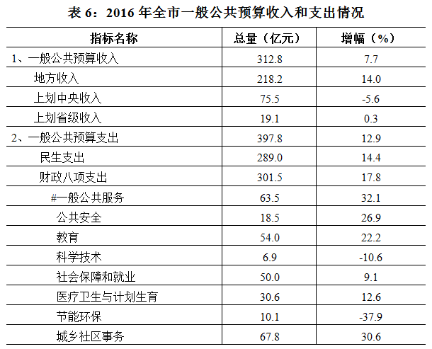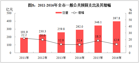 全市一般公共预算支出397.8亿元,增长12.9%。其中,财政用于民生支出289亿元,增长14.4%;财政八项支出301.5亿元,增长17.8%。