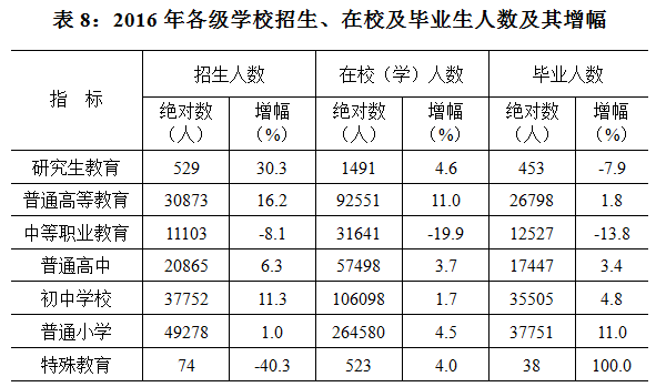 年末全市有普通高校13所。普通高等教育研究生毕业生453人,普通高等教育毕业生26798人,中等职业教育毕业生12527人,普通高中毕业生17447人,初中学校毕业生35505人,普通小学毕业生37751人,在园幼儿14.7万人。小学适龄儿童入学率100%,九年义务教育巩固率97.7%。各类民办学校990所,民办学校在校学生16.9万人。发放高校国家奖学金、助学金8146.5万元,落实义务教育保障资金2.7亿元。