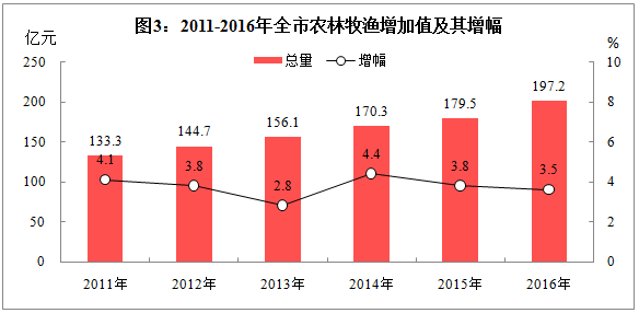 全市农林牧渔业增加值197.2亿元,比上年增长3.5%。其中,农业99.7亿元,增长3.3%;林业18.8亿元,增长4.1%;畜牧业70亿元,增长3.4%;渔业8.7亿元,增长3.4%。