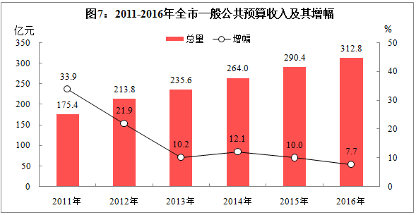 全市一般公共预算收入312.8亿元,比上年增长7.7%,占GDP的比重为12.4%。其中,地方收入218.2亿元,增长14%。全市各项税收总收入200亿元,下降1.2%,占财政总收入的比重为63.9%。