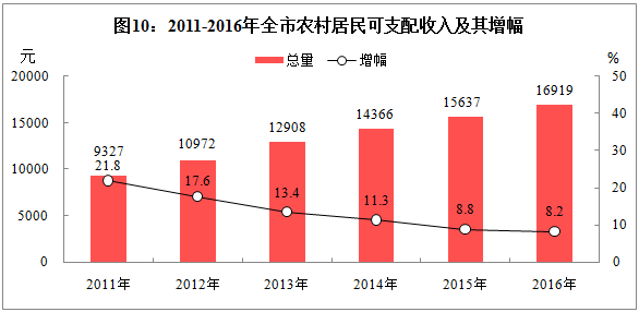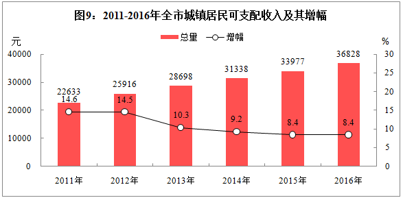 全市城镇居民人均可支配收入36828元,比上年增长8.4%。其中,工资性收入21321元;经营净收入4866元;财产性收入7261元;转移性收入3380元。农村居民人均可支配收入16919元,增长8.2%。其中,工资性收入8019元;家庭经营纯收入5573元;财产性收入582元;转移性收入2745元。城乡居民收入比为2.18:1。城镇居民和农村居民人均消费支出分别为24348元和12746元,其中,食品支出分别为6775元和3877元。城乡居民恩格尔系数为28.5%,比上年下降2.8个百分点。