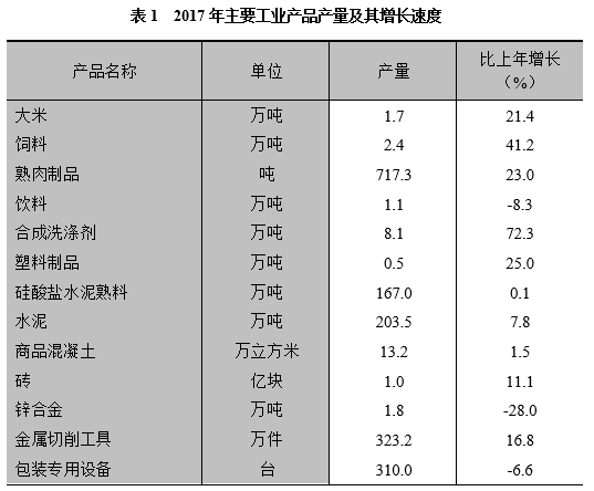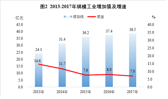 全年全部工业增加值39.6亿元,增长7.1%。规模以上工业增加值38.5亿元,增长7%。在规模以上工业中,分经济类型看,国有企业增长0.6%,集体企业下降76.5%,股份制企业增长7.9%,外商及港澳台商投资企业增长17.8%,其他经济类型企业下降4%。