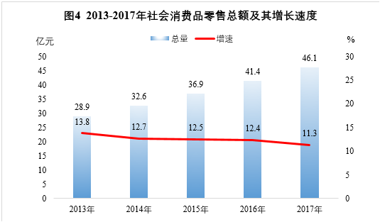 全县社会消费品零售额46.1亿元,比上年增长11.3%。按消费形态统计,批发业1.5亿元,增长8.5%;零售业38.9亿元,增长11.1%;住宿业0.3亿元,增长7.9%;餐饮业5.5亿元,增长13.2%。按地区统计,城镇消费38.7亿元,增长11.8%;农村消费7.4亿元,增长8.5%。在限额以上企业商品零售额中,粮油、食品类零售额增长7.9%,饮料类零售额增长13.4%,烟酒类零售额增长26%,化妆品类增长35.2%,日用品类增长38.1%,中西药品类增长28.1%,石油及制品类下降8.1%。全年新增市场主体2000余个,省市名牌产品达26个。