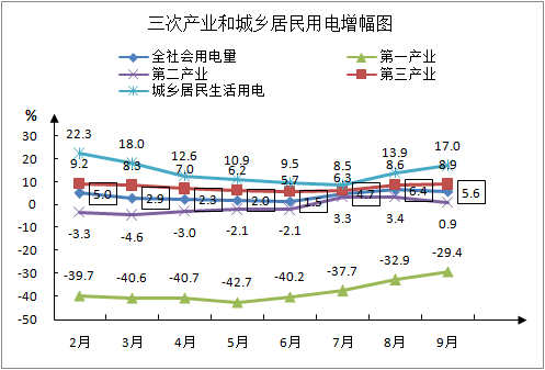 前三季度,一、二、三次产业用电量分别为0.30亿千瓦时、47.43亿千瓦时和15.26亿千瓦时,第一产业下降29.4%,第二产业和三产业分别增长0.9%和8.9%。其中,工业用电量46.6亿千瓦时,同比增长0.9%,较去年同期提高15个百分点。城乡居民和第三产业用电量增长较快,分别拉动全社会用电量提高3.7个百分点和1.6个百分点。