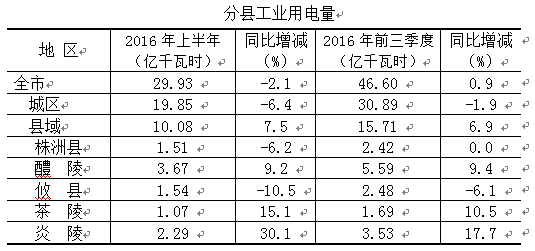 前三季度,全市工业用电量为46.60亿千瓦时,同比增长0.9%,其中,城区30.89亿千瓦时,同比下降1.9%;五县15.71亿千瓦时,同比增长6.9%,攸县工业用电量累计下降6.1%,株洲县与去年持平,炎陵、茶陵和醴陵工业用电量累计分别增长17.7%、10.5%和9.4%。