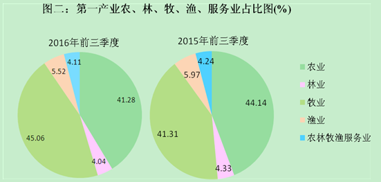 从产业结构看, 牧业 占比明显提高,前三季度,牧业产值为80.29亿元,在农林牧渔业总产值中占比为45.06%,较去年同期提高3.75个百分点;农业总产值73.57亿元,在农林牧渔业总产值中占比为41.28%,较去年同期下降2.86个百分点。 从种植业结构看,粮食作物种植呈下降趋势,秋粮有望丰收。从农产品结构看,茶叶、高山水果、烟叶、水果玉米、葡萄等名优特农产品播种面积明显增加、供给增多。从畜牧业生产看, 生猪出栏降幅收窄, 大牲畜出栏、家禽出笼有不同程度增长。从农业产业化角度看,以采果、体验农作,享受乡土情趣为主的休闲农 业发展较快。