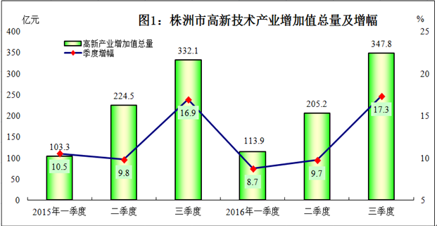 前三季度,高新技术产业实现总产值1259.5亿元,增长15.5 %;实现高新技术产业增加值347.8亿元,增长17.3%。高新技术产业总产值和增加值增幅分别较二季度提升 6.4、7.6个百分点,高于去年同期0.4个百分点(详见图1),