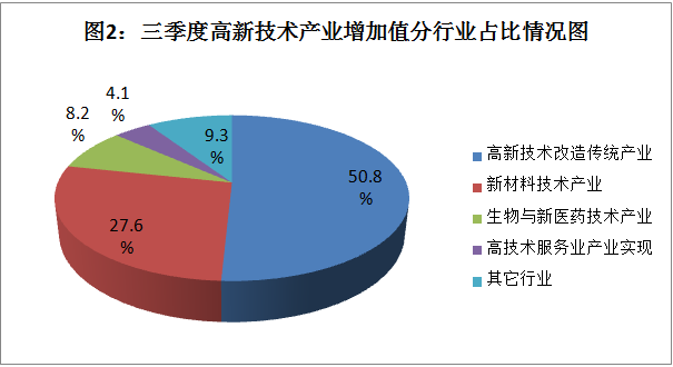 前三季度,高新技术改造传统产业、新材料技术两大主导产业共实现高新技术产业增加值272.7亿元,增长16.6%,占全市高新技术产业增加值比重为78.4%。较去年同期提升0.5个百分点。其中:高新技术改造传统产业实现高新技术产业增加值176.8亿元,新材料技术产业实现高新技术产业增加值95.9亿元,分别增长20.8 %和9.47 %,占全部高新技术产业增加值比重分别为50.8%和27.6%。其它产业占比情况(详见图2)。