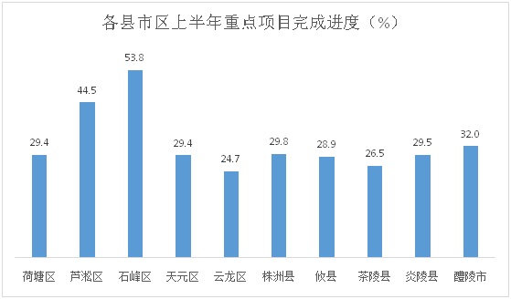 从各县市区完成情况来看,城区快于县域。上半年,城区重点建设项目151个(不含跨区项目),完成投资额147.8亿元,占年度计划的37%,县域重点建设项目156个(不含跨区项目),完成投资额103.2亿元,占年度计划的29.5%。石峰区和芦淞区进展较快,分别完成53.8%和44.5%。