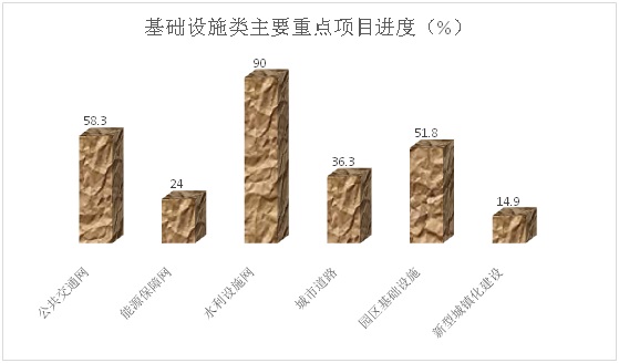 2、公共交通、水利、园区三类基础设施项目进展较快。上半年,全市公共交通网重点项目10个,完成投资额14.8亿元,占年度计划的58.3%;水利基础设施重点项目1个,完成投资额1.6亿元,占年度计划的90%;园区基础设施重点项目22个,完成投资额46.5亿元,占年度计划的51.8%。以上三类分别高于基础设施类项目平均进度23.1、54.8和16.6个百分点。