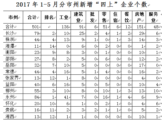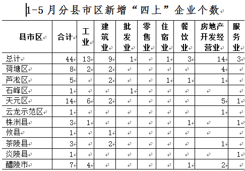 3、新增“四上”企业集中房地产和工业两大行业。1-5月全市新增房地产开发企业14家,同比增加2家,占全市的比重为31.8%;新增规模工业企业13家,同比增加13家,占全市的比重为29.5%,其中天元区、醴陵市分别增加6家、4家。其次建筑业新增9家;服务业、餐饮业各新增3家;批发业、住宿业各新增1家;零售业新增企业数尚未实现零的突破。