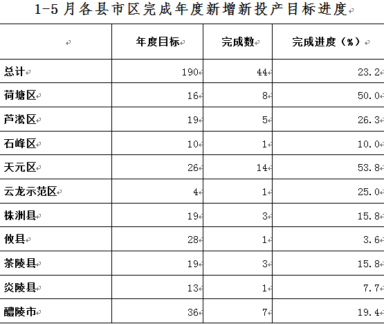 4、与年度目标任务比,进度参差不齐。今年全市新增新投产“四上”企业入库目标为190家。前5个月已完成44家,占年度目标的23.2%。目前进度较快的天元区(53.8%)和荷塘区(50%)均已超额完成上半年目标任务(30%),芦淞区和云龙示范区接近完成上半年目标,攸县(3.6%)、炎陵县(7.7%)和石峰区(10%)进度比较滞后。