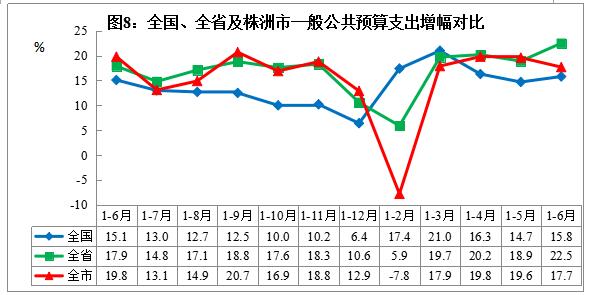 六、民生民利持续改善。一是脱贫攻坚深入推进。 上半年实施各类扶贫项目600余个,争取项目资金7亿元,70多个贫困村初步形成了“一村一品”,产业扶贫效果初显。 二是民生投入力度加大。 全市财政民生支出170.5亿元,增长18.7%,占一般公共预算支出比重为72.4%。其中,教育支出增长23.6%,社会保障和就业支出增长13.2%。 三是城镇就业基本稳定。 全市城镇新增就业3.1万人,同比增长4.7%,新增农村劳动力转移就业0.96万人。 四是居民收入稳步增长。 株洲调查队抽样调查显示,全市居民人均可支配收入1618 8 元,增长8.4%,比一季度提高0.3个百分点,其中,城镇居民人均可支配收入19878元,增长8.1%,比一季度提高0.2 个百分点;农村居民人均可支配收入10432元,增长8%,比一季度提高0.2个百分点。 五是物价涨幅温和。 全市居民消费价格累计上涨1.7%,较上年同期收窄0.5个百分点。