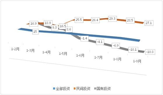 2、民间投资增长快,国有投资逐月走低。受同期基数较低,政策刺激利好等因素影响,全市民间投资继续保持快速增长。1-9月份,全市民间投资增长27.1%,投资额达到942.0亿元,占全市固定资产投资额的比重为57.9%,拉动全市投资增长13.9个百分点,对全市投资增长的贡献率为112%。全市国有投资552.0亿元,下降10.8%,逐月走低。