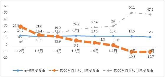 1、大项目不足,小项目偏多。1-9月,全市5000万元以上项目580个,实现投资额662.0亿元,下降10.7个百分点。进入下半年以来,5000万元以上项目投资额增速下滑明显(详见下图)。亿元以上新开工项目108个,同比减少79个。
