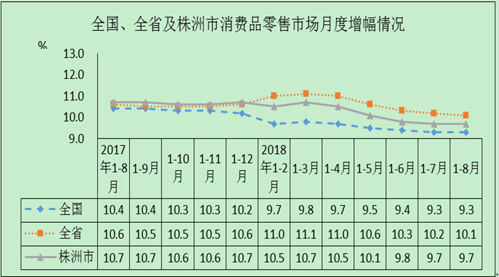 2、与其他市州比较。1-8月社会消费品零售总额增幅较上月回落0.1个百分点的有6个,分别为湘潭、衡阳、常德、张家界、怀化和娄底;回落0.2个百分点的有2个,分别郴州和永州;持平的有6个,分别为长沙、株洲、邵阳、岳阳、益阳和湘西。