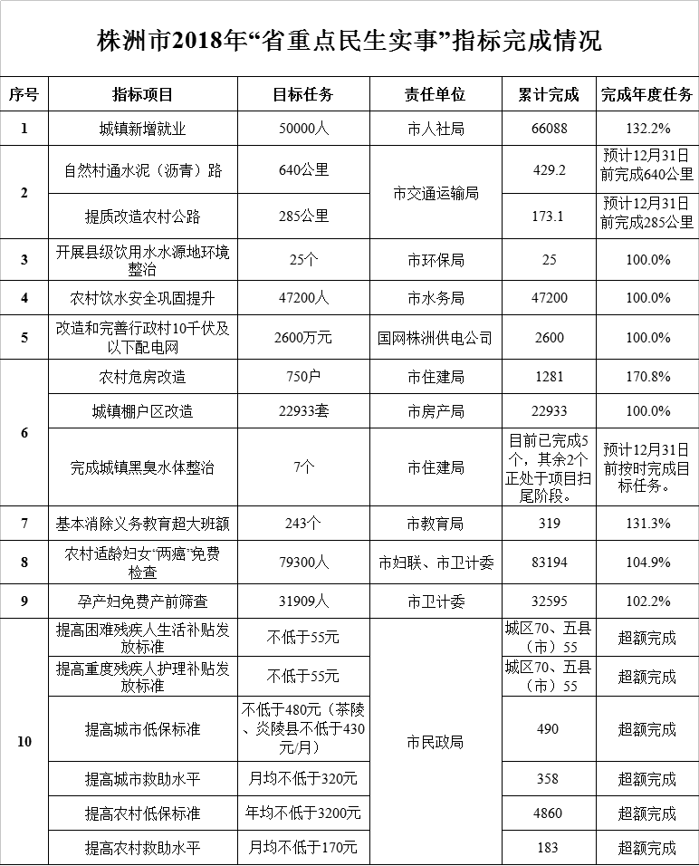 株洲市2018年“省重点民生实事”指标完成情况公示