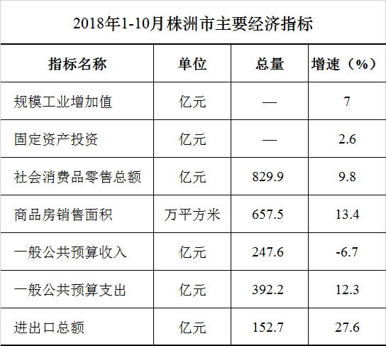 2018年1-10月株洲市主要经济指标