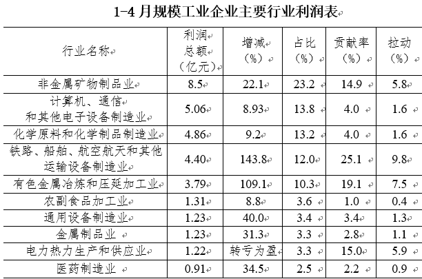 (二)分行业来看,大多数行业实现盈利。1-4月,36个工业大类行业中,有33个行业实现盈利,占比为94.4%。其中有28个行业利润保持增长态势。利润增长最快的是铁路船舶航空航天制造业,增长近1.4倍;其次是水的生产和供应业,增长1.2倍;排第三的是有色金属冶炼和压延加工业,增长1.1倍。有2个行业实现转亏为盈,它们分别是电力热力生产和供应业、酒饮料和精制茶制造业。