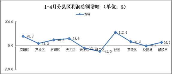 (三)分县区来看,经济效益整体较好。1-4月,全市有7个县区利润增长,他们分别是荷塘区、天元区、石峰区、芦淞区、攸县、茶陵县、醴陵市。其他3个县区利润下降,渌口区利润下降48.5%。