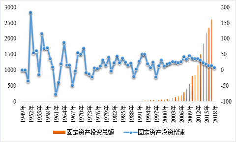 图2:1949-2018年全市固定资产投资总额及增速(亿元,%)