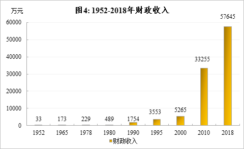 1952年县财政收入只有33万元,1965年是173万元达到三位数,处于经济复苏期。1990年到1754万元达到四位数,增长相对比较缓慢。自1992年全国新一轮改革开放开始,经济总量迅速扩张,财政收入实现加速增长,到2006年财政收入是1990年的5多倍,达到10008万元。进入新时代,财政收入连续跨越新台阶,到2018年,县财政收入达到57645万元,比1952年增长1745.8倍。