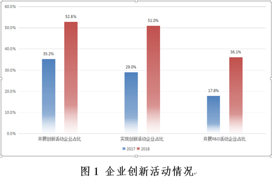 2018年,全市开展创新活动的企业数为801家,占规模以上工业企业总数的52.8%,成功实现创新活动的企业数为774家,占总数的51.0%,同比分别提高17.6个和22.0个百分点(见图1)。其中开展R&D的企业达到548家,占比为36.1%,比上年提升18.3个百分点。全市规模以上工业企业研究开发费用合计75.02亿,户均研发费用为494.20万元,有研发费用支出的企业占比为42.3%。