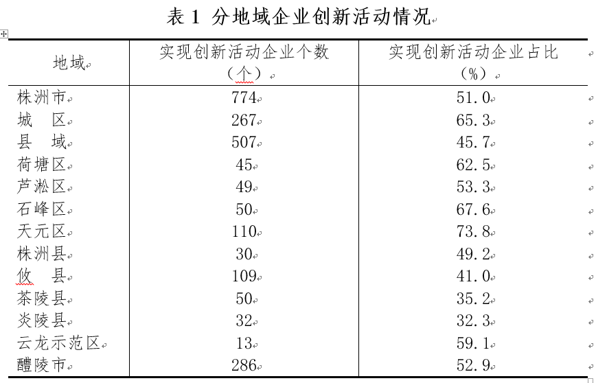 从地域范围看,城区企业创新活动活跃度高于县域企业(见表1)。城区企业(未含渌口)实现创新活动的企业比重为65.3%,远高于县域企业的45.7%。其中,天元区企业创新活动实现程度最高,占比达73.8%;炎陵县程度最低,仅占32.3%。其他县市区实现创新活动企业占比分别为:石峰区67.6%,荷塘区62.5%,云龙示范区59.1%,芦淞区53.3%,醴陵市52.9%,株洲县49.2%,攸县41.0%,茶陵县35.2%。