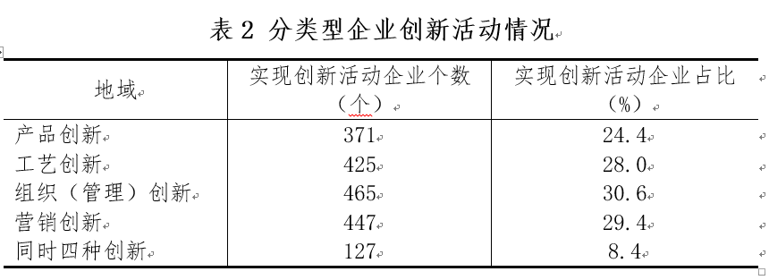 从四种创新活动类型看(见表2),实现产品创新的企业371家,占比24.4%,比上年提升11.3个百分点;实现工艺创新的企业425家,占比28.0%,比上年提升10.4个百分点;有组织(管理)创新的企业465家,占全部企业的比重为30.6%,比上年提升12.4个百分点;有营销创新的企业447家,占全部企业的比重为29.4%,比上年提升10.4个百分点。其中超三成企业同时采用两种或两种以上的创新方式。同时实现产品创新、工艺创新、组织(管理)创新、营销创新四种创新的企业127家,占比为8.4%,比上年提升1.6个百分点。