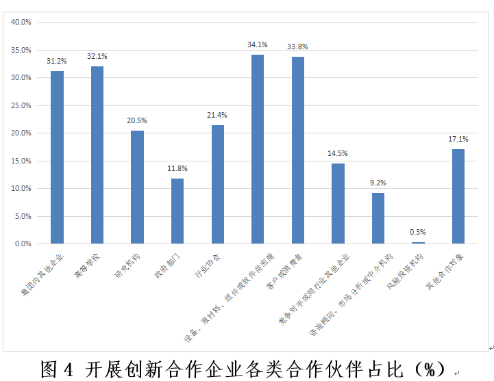 从创新合作伙伴看,主要有集团内其他企业、高等学校、研究机构、政府部门、中介机构、风险投资机构等多种合作对象(见图4)。其中34.1%的创新合作企业与设备、原材料、组件或软件供应商开展合作,33.8%的创新合作企业与客户或消费者开展合作,32.1%的创新合作企业与高等学校开展合作,31.2%的创新合作企业与集团内其他企业开展合作,这四种合作对象是企业创新合作的主要对象。