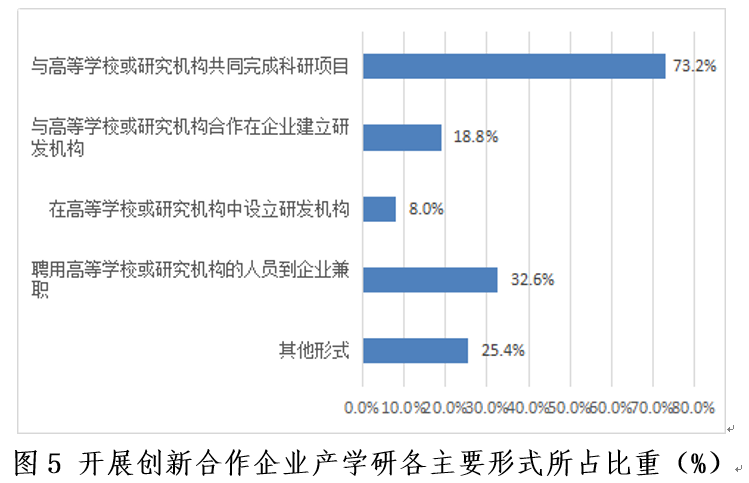 在与高等学校和研究机构的合作方面(见图5),第一选择是与高等学校或研究机构共同完成科研项目,占73.2%;第二选择是聘用高等学校或研究机构的人员到企业兼职,占32.6%。