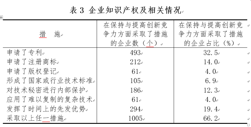 知识产权保护意识不断加强。2018年全市66.2%的工业企业采取了知识产权保护或相关措施(见表3),同比提高了11.7个百分点。为保持和提高企业创新竞争力,在注重知识产权保护的内容方面,工业企业主要采取了申请发明专利、申请注册商标、对技术秘密进行内部保护和发挥时间上的先发优势四类措施。其中,共有32.5%的企业采用申请专利的方法提升技术优势;19.4%的企业采用以发挥时间上的先发优势为主的方法;14.0%的企业采用申请注册商标的方法提高创新竞争力;12.3%的企业采用对技术秘密进行内部保护的方法进行知识产权保护。