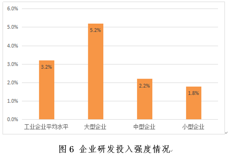 中小型企业研发投入强度低于工业企业平均水平(见图6)。全市规模以上工业企业研究开发费用合计75.02亿,占其主营业务收入的比重为3.2%。其中,中、小型企业研发经费投入强度分别为2.2%、1.8%,低于工业企业平均水平1.0、1.4个百分点。中小型企业研发投入强度需要进一步强化和提升。