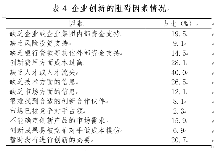 “缺乏人才或人才流失”、“创新费用方面成本过高”、“缺乏技术方面的信息”等因素被认为是阻碍企业技术创新活动开展的前三大主要因素(见表4),分别占总企业数的40.0%、28.1%和26.5%。在其他阻碍因素中,“暂时没有进行创新的必要”占20.7%,“缺乏企业或企业集团内部资金支持”占19.5%,“不能确定创新产品的市场需求”占15.9%,“缺乏银行贷款等其他外部资金支持”占14.5%,“缺乏市场方面的信息”占12.1%。“缺乏风险投资支持”、“很难找到合适的创新合作伙伴”、“市场已被竞争对手占领”和“创新成果易被竞争对手低成本模仿”等因素占比均在10%之下。