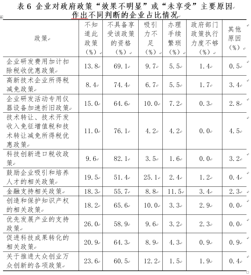 在对企业认为政府政策“效果不明显”或“未享受”主要原因的调查中发现(见表6),几乎所有政策都显示出“不具备享受该政策的资格”为企业认为政策对企业开展创新活动效果不明显或者未享受过相关政策的第一因素,“不知道此政策”为第二因素,“吸引力不足”为第三因素。表明政府政策在准入门槛设定以及落实等方面仍存在不足。