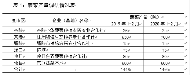 (一)影响蔬菜流通。疫情以来,全市餐饮行业共退掉和延期婚宴2000多桌、家庭聚会用餐上千场,饭店、聚餐对蔬菜的需求量大大减少,蔬菜基地商超对接有难度,导致已成熟蔬菜得不到及时采收,蔬菜销量急剧下降。从我们得到的数据显示,疫情对蔬菜的生产影响不大,但对蔬菜的流通影响特别大。从调查的6家蔬菜基地产量来看,4家与去年同期持平, 1家有所提高,1家略有下降,但调查过程中企业普遍反馈蔬菜有产量无销量,渌口区的陈塘蔬菜基地2020年以来仅销售1.5吨,攸县的2家蔬菜基地也都表示基本没有销售额,蔬菜目前仍然生长在土里。具体见表1。