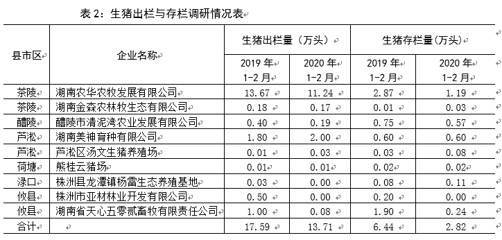(二)影响生猪补栏。2019年底,株洲生猪产量有所回升,但受疫情的影响,生猪出栏、存栏都有一定的下降。从调研来看,一方面,受新冠疫情的影响,乡村地区道路有所管制,物流受阻导致饲料无法运送,另一方面,人员居家隔离导致买卖受限,生猪的生产和销售两端受到双重挤压。饲料的短缺影响生猪的补栏情绪,但随着对“菜篮子”农产品绿色通道开放等政策的实施,疫情对生猪的影响将逐步减小。从调查访问的9家养猪企业来看,2020年1-2月,9家企业的生猪出栏量预计下降22%,生猪存栏量下降56%。具体见表2。