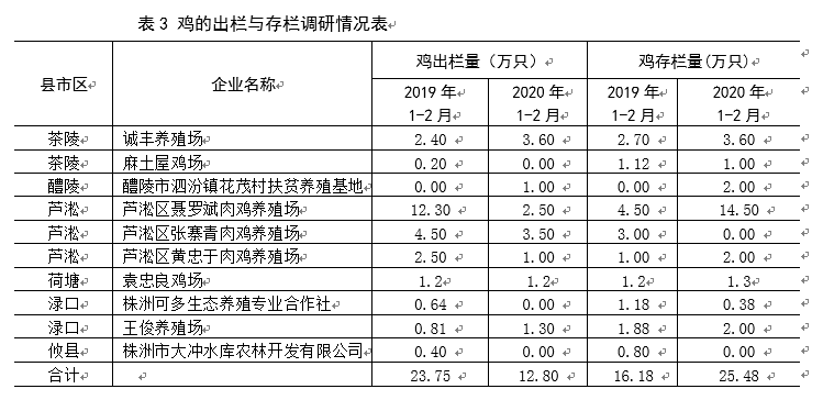 (三)影响家禽出栏。出于疫情防控工作的需要,1月27日,株洲疫情防控工作领导小组发布了暂时禁止全市农贸市场活禽交易与宰杀的禁令,由此导致活禽养殖时间加长,养殖成本加大,再加上2月1日邵阳发生了一起家禽H5N1亚型高致病性禽流感疫情,家禽市场恐慌加剧,活禽养殖业受两种疫情影响较大。从调查访问的10家养鸡企业来看,有6家企业的鸡的出栏量出现了不同程度的下降,其中,依靠传统活禽交易市场交易的肉鸡影响较大,如芦淞区聂罗斌肉鸡养殖场2019年1-2月出栏量为12.3万只,2020年1-2月预计只有2.5万只,同比下降79.7%。10家企业预计2020年1-2月鸡的出栏量下降46.1%,鸡的存栏量增加54.5%。具体见表3。