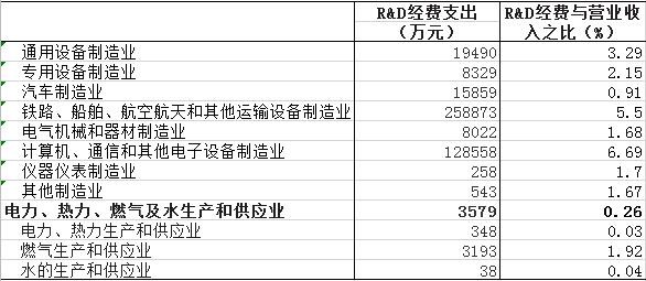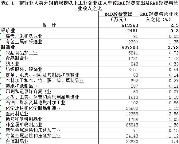 2018年,规模以上工业企业法人单位R&D经费支出613364万元,比2013年增长81.7%;R&D经费与营业收入之比为2.5%。规模以上工业企业法人单位分行业R&D经费支出及R&D经费与营业收入之比详见表6-1。