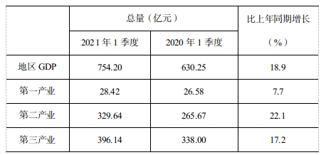 根据地区生产总值统一核算结果,一季度,全市地区生产总值为754.20亿元,按可比价格计算,同比增长18.9%。分产业看,第一产业增加值28.42亿元,增长7.7%;第二产业增加值329.64亿元,增长22.1%;第三产业增加值396.14亿元,增长17.2%。