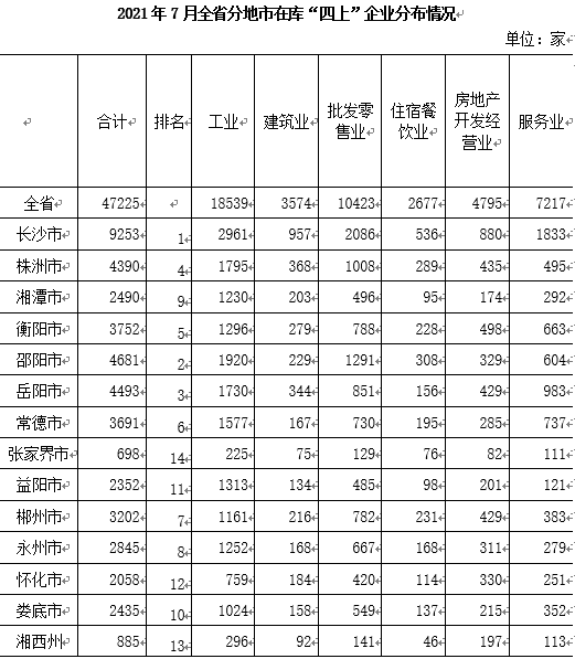 7月,我市联网直报库“四上”企业4390家,占全省“四上”企业总数的9.3%,位列长沙(9253家)、邵阳(4681家)、岳阳(4493家)之后,居全省第4,也是“四上”企业总数突破4000家的四个地市之一,比第5位的衡阳多638家。从专业在全省的排位来看,我市除服务业外其他专业的企业数均居全省前3,其中:建筑业全省第2位,工业、批发零售业、房地产开发经营业、住宿餐饮业均列全省第3位,服务业495家居全省第6位。
