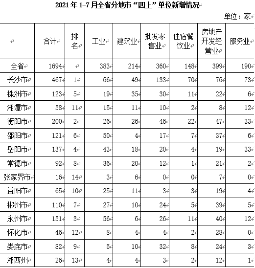 1-7月,我市新增“四上”企业123家,较去年同期增加2家,增长1.7%,新增企业数在全省排位由上半年的第4位后退到第5位。其中,7月当月新增“四上”企业17家,在全省并列第9位;而岳阳当月新增32家,反超株洲,由上月末的第5位上升到第4位。从各专业本年新增数量来看,我市与岳阳的差距主要体现在服务业和工业,分别比岳阳少27家和24家。