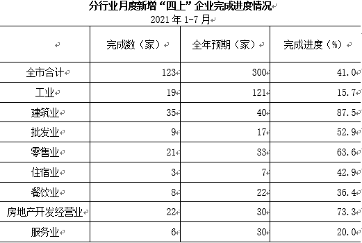 现行统计制度规定,建筑业和房地产开发经营业企业申报“四上”企业只需提供住建部门核发的资质证书,而其他行业企业申报时要求营业收入必须达到规模(限额)标准。1-7月,全市建筑业、房地产开发经营业分别新增“四上”企业35家和22家,完成进度为87.5%和73.3%,新增数量和完成进度均居各行业前2位。