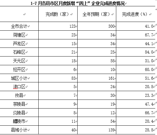 年初,我市设立了月度新增“四上”企业300家的培育工作预期。前7个月,全市已完成新增“四上”企业123家,总体完成进度为41%。从地域分布来看,城区1-7月新增企业83家,比县域多43家,完成进度为51.6%,比县域(28.8%)快22.8个百分点;县市区中居前3位的分别是石峰区(84%)、荷塘区(67.7%)、炎陵县(66.7%),而醴陵市、渌口区、攸县完成进度较慢,仅完成20.4%、20.8%、23.3%,石峰区的完成进度领先醴陵市63.6个百分点。
